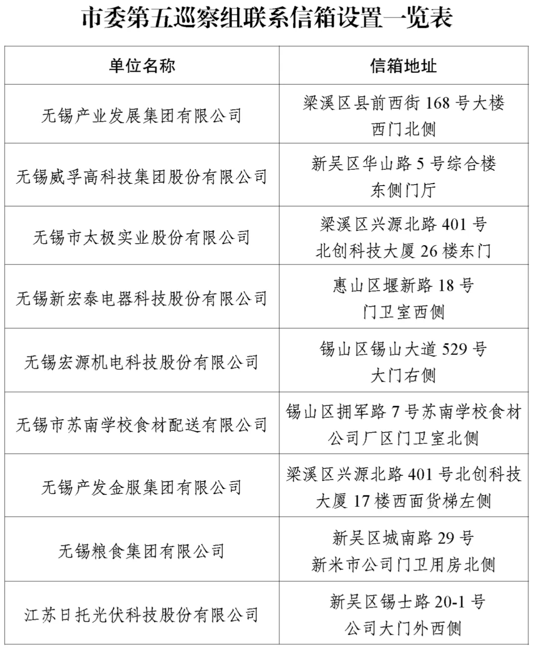 市委巡察公告 根據市委巡察工作領導小組統(tǒng)一部署,市委第五巡察組對無錫產業(yè)發(fā)展集團有限公司黨委開展常規(guī)巡察,時間為2024年4月25日至7月5日。根據有關規(guī)定,市委巡察組主要受理反映無錫產業(yè)發(fā)展集團有限公司黨委領導班子及其成員、下一級主要負責人以及相關重點崗位干部(含已離退休、已調離)的來信來電來訪。其他不屬于巡察受理范圍的信訪問題,將按規(guī)定轉交有關部門認真辦理。市委巡察組受理信訪時間截止到2024年7月2日。 巡察期間設專門舉報電話:18800559869,可同時接收短信、微信,接聽時間為工作日8:00-18:00; 郵政信箱:江蘇省無錫市0450號郵政信箱; 郵政編碼:214031; 聯(lián)系信箱:無錫產業(yè)發(fā)展集團有限公司(梁溪區(qū)縣前西街168號)大樓西門北側。 特此公告。 中共無錫市委第五巡察組 2024年4月25日 ![]() ![]() |