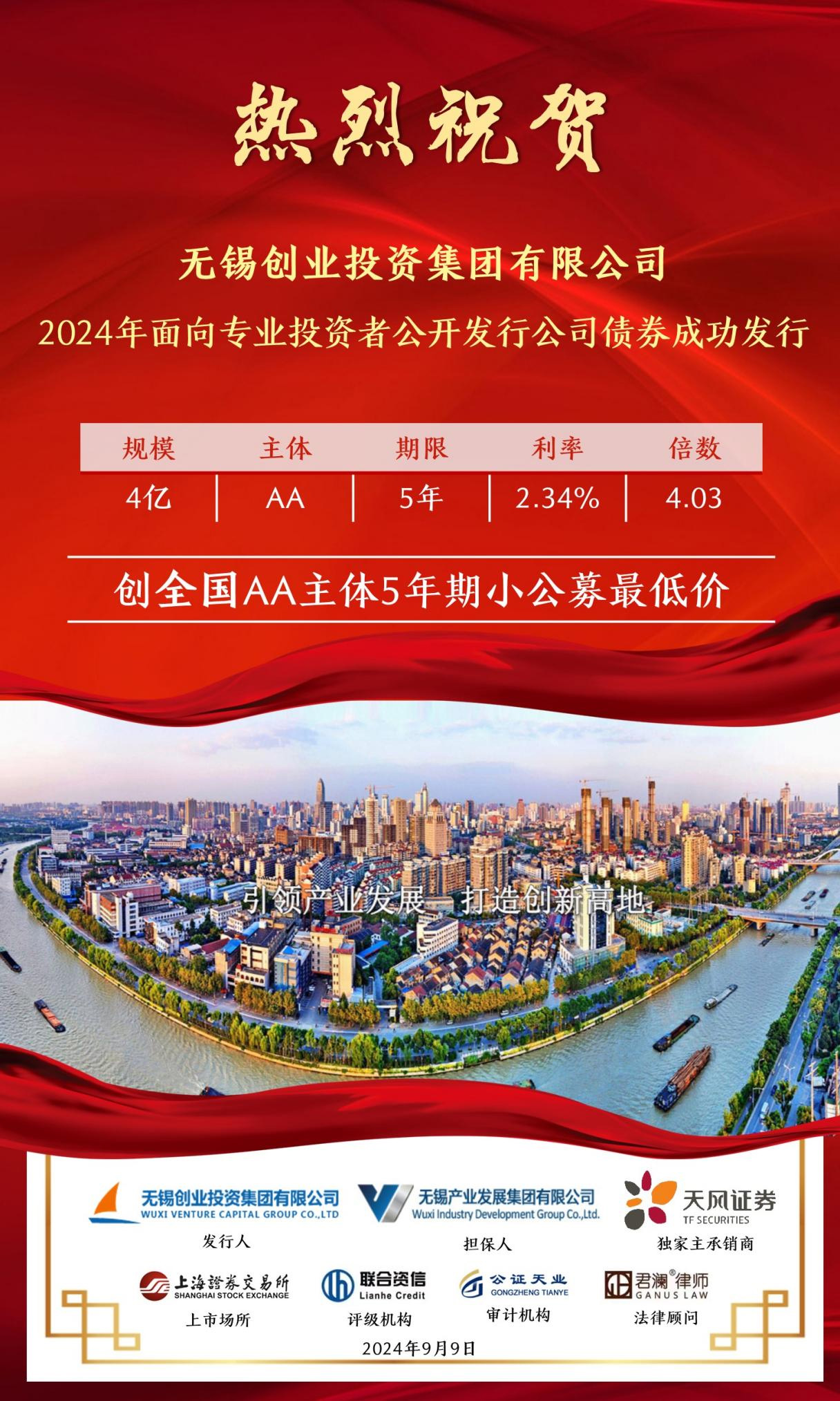 9月9日,無(wú)錫創(chuàng)業(yè)投資集團(tuán)有限公司(簡(jiǎn)稱“無(wú)錫創(chuàng)投集團(tuán)”)2024年面向?qū)I(yè)投資者公開(kāi)發(fā)行公司債券“24錫創(chuàng)01”成功發(fā)行,發(fā)行規(guī)模4億元,發(fā)行期限5年,認(rèn)購(gòu)倍數(shù)4.03倍,票面利率2.34%,創(chuàng)全國(guó)可比債券歷史發(fā)行最低利率!本期債券由天風(fēng)證券承銷,主體評(píng)級(jí)AA,債項(xiàng)評(píng)級(jí)AAA。 無(wú)錫創(chuàng)投集團(tuán)作為無(wú)錫產(chǎn)業(yè)集團(tuán)旗下的創(chuàng)業(yè)投資和股權(quán)投資平臺(tái),近年來(lái)在集團(tuán)的正確領(lǐng)導(dǎo)和大力支持下,圍繞無(wú)錫“465”現(xiàn)代化產(chǎn)業(yè)集群建設(shè),聚焦產(chǎn)業(yè)集團(tuán)“1+4+X”產(chǎn)業(yè)布局,持續(xù)深化產(chǎn)融協(xié)同合作,不斷提升資金使用效率,努力為公司高質(zhì)量發(fā)展提供更低成本、更長(zhǎng)周期、更加靈活的資金支持。未來(lái),公司將繼續(xù)承擔(dān)國(guó)企社會(huì)責(zé)任,勇挑重?fù)?dān),發(fā)揮自身優(yōu)勢(shì),持續(xù)為無(wú)錫新質(zhì)生產(chǎn)力和實(shí)體經(jīng)濟(jì)高質(zhì)量發(fā)展注入新活力、增添新動(dòng)能。 |